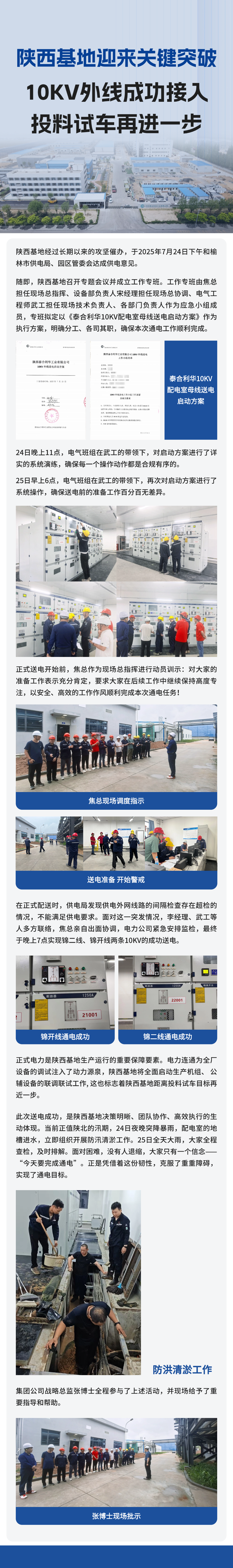 陜西基地迎來(lái)關(guān)鍵突破!10KV外線成功接入 投料試車再進(jìn)一步
